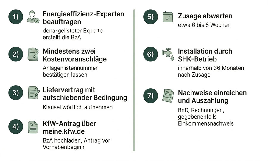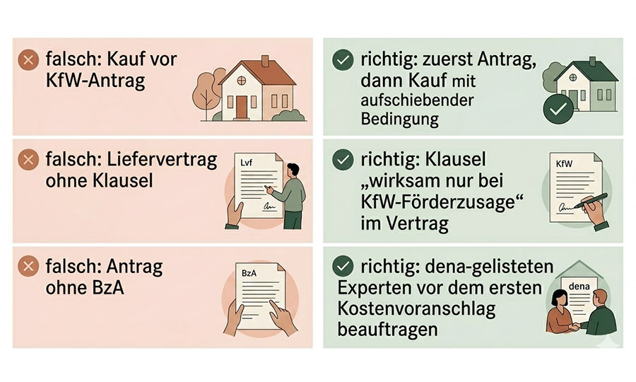 Vermeidung: Niemals ohne Bestätigung zum Antrag und ohne KfW-Zusage bestellen. Folgen Sie strikt der 7-Schritte-Reihenfolge.